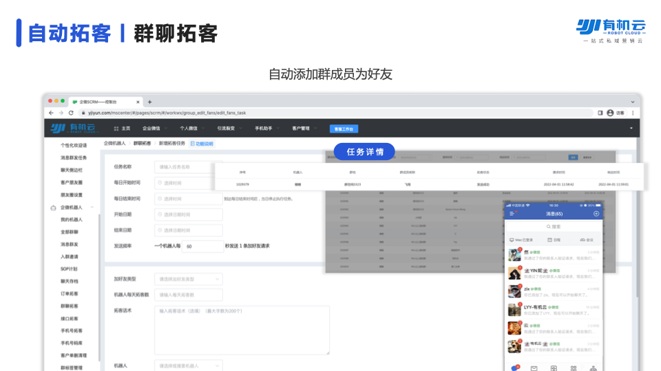 通过Excel模板上传客户手机号数据到有机云SCRM,并配置自动拓客任务,即可开始自动拓客。