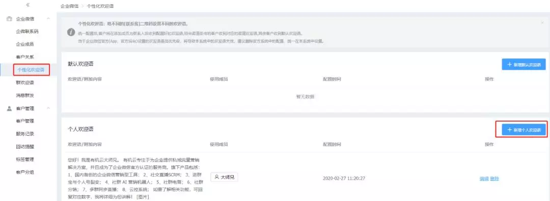 3.设置个性化欢迎语,当有用户添加过来,会自动通过好友请求并发送设置好的欢迎语
