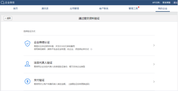 (2)企业微信支持两种认证方式:“通过微信公众号授权认证(快捷认证)”或“通过提交资料进行认证”