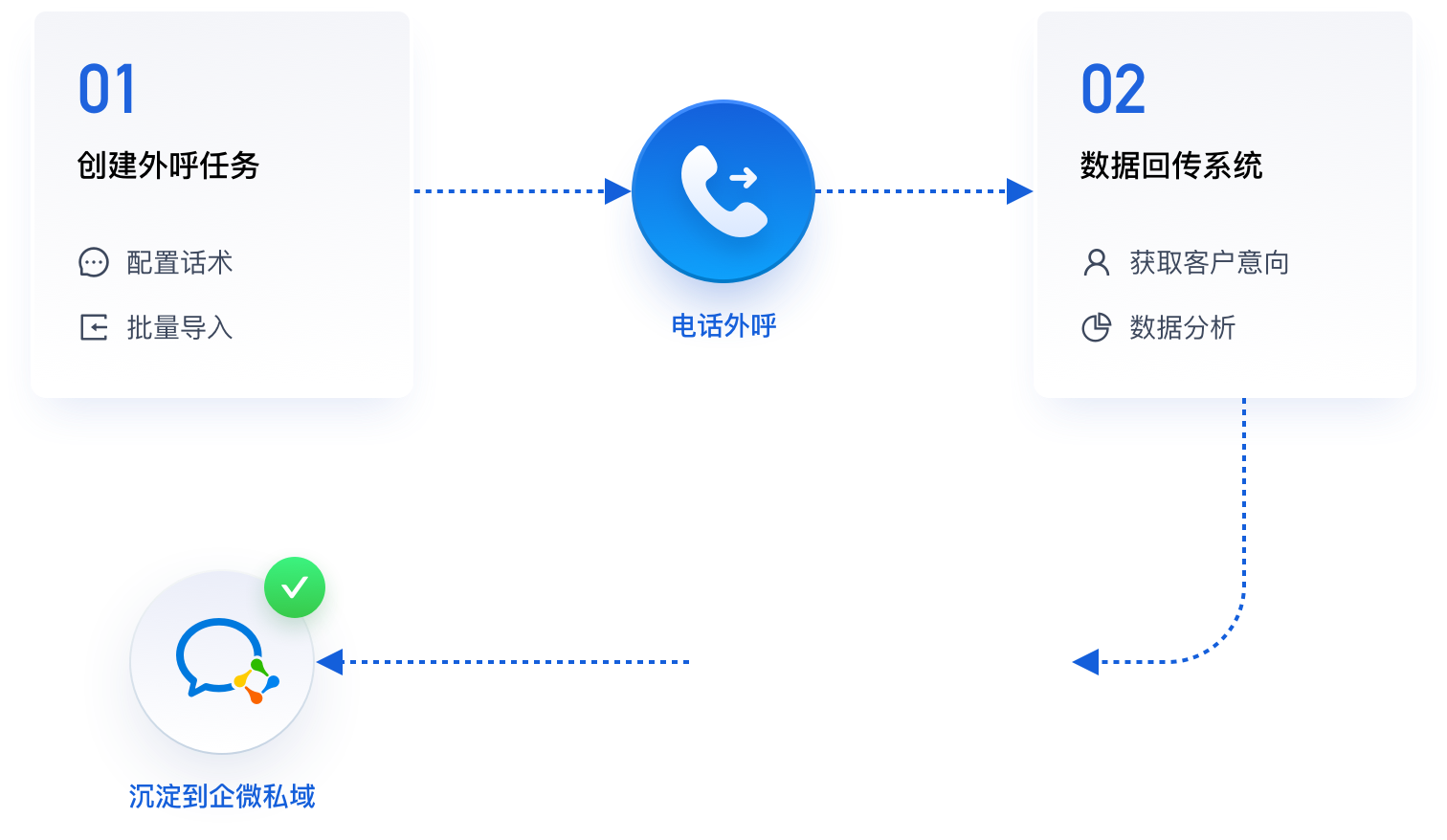 基于AI外呼机器人对存量线索、配合成熟的话术模板进行高效触达,筛选用户并引导加微,将用户沉淀到企业私域流量池