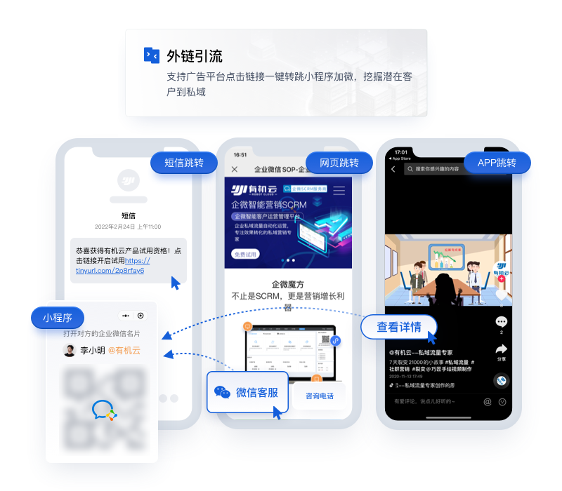 用户意向数据回传系统之后,企微机器人自动给未接通和低意向用户发送挽回短信,配合有机云的外链引流链接,高效触达挽回,增加加粉成功率